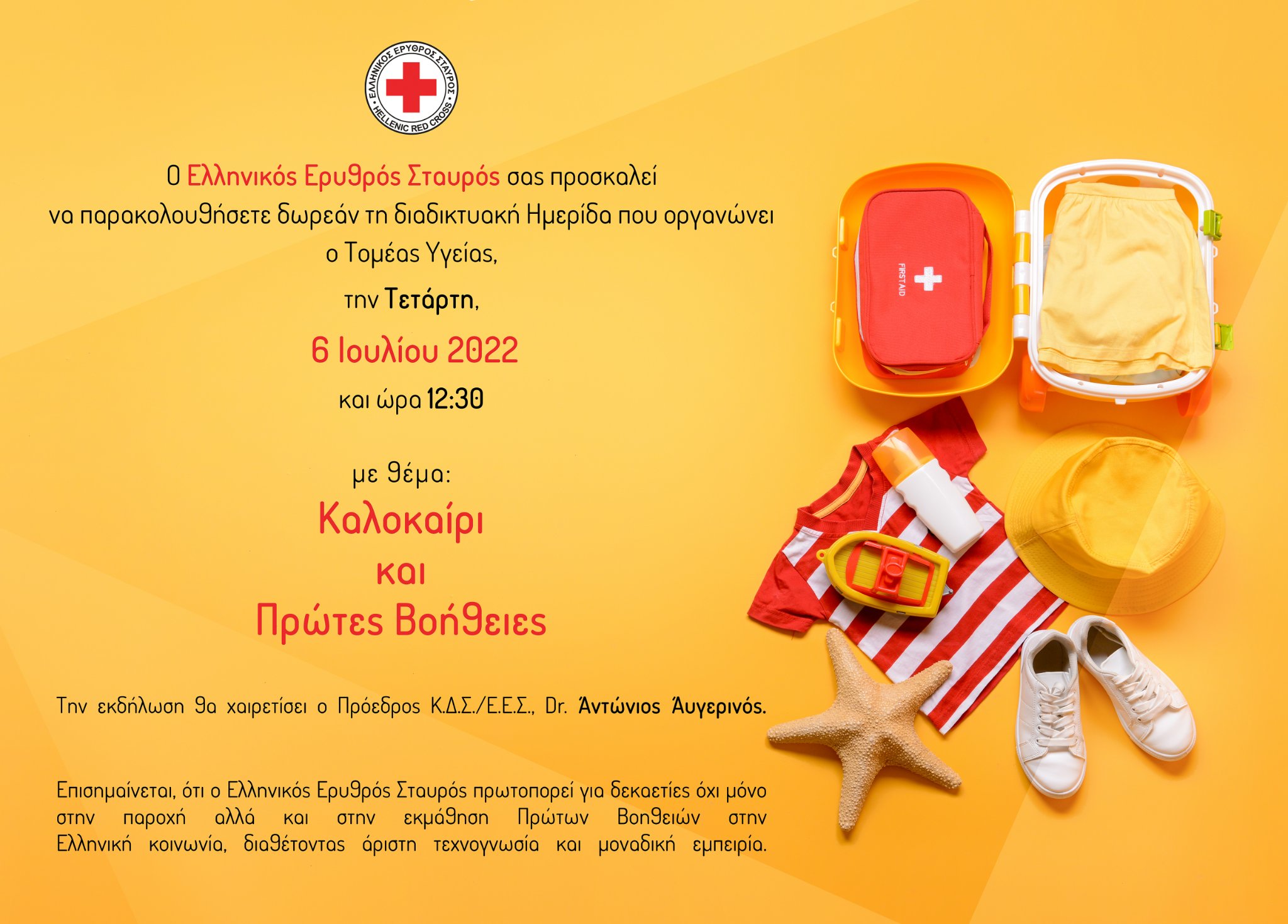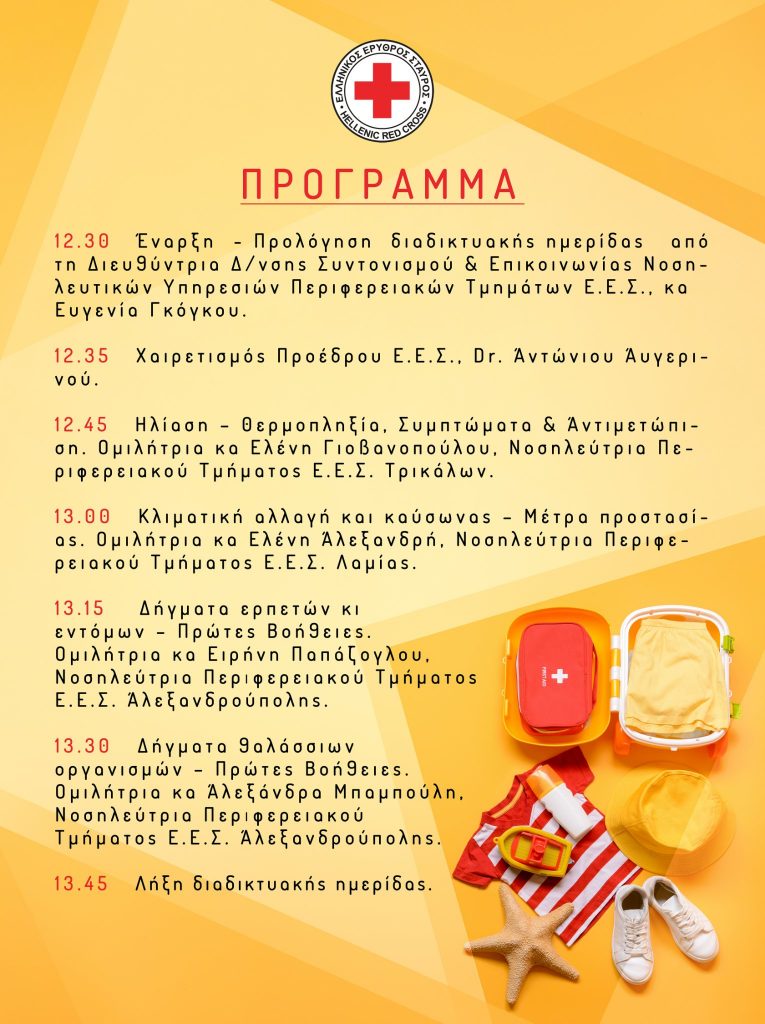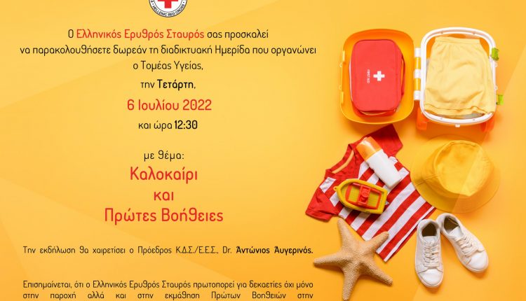 Ο Ελληνικός Ερυθρός Σταυρός, την Τετάρτη 6 Ιουλίου 2022 και ώρα 12:30 μ.μ. διοργανώνει διαδικτυακή ημερίδα με θέμα «Καλοκαίρι και Πρώτες Βοήθειες», η οποία θα μεταδοθεί δωρεάν από το κανάλι του YouTube του Ελληνικού Ερυθρού Σταυρού. Την ημερίδα θα χαιρετήσει ο Πρόεδρος του Ε.Ε.Σ, Dr. Αντώνιος Αυγερινός.