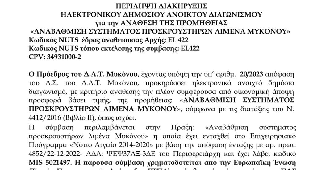 Προκηρύχθηκε από το Δημοτικό Λιμενικό Ταμείο της Μυκόνου διεθνής διαγωνισμός για την αναβάθμιση του συστήματος προσκρουστήρων του Λιμένα Μυκόνου.
