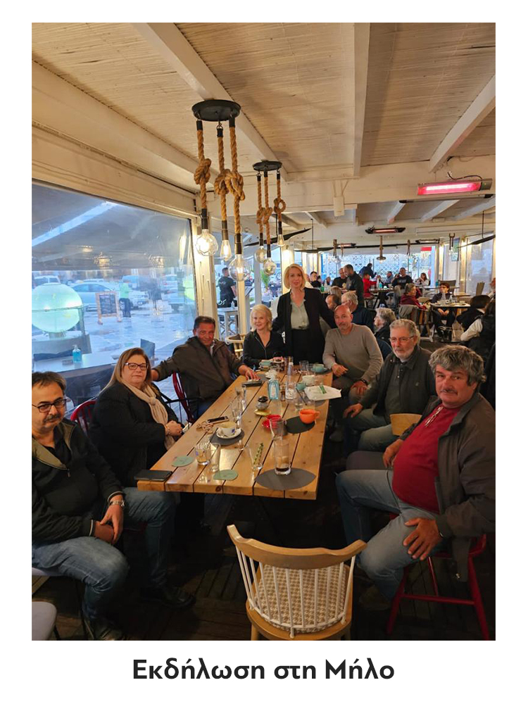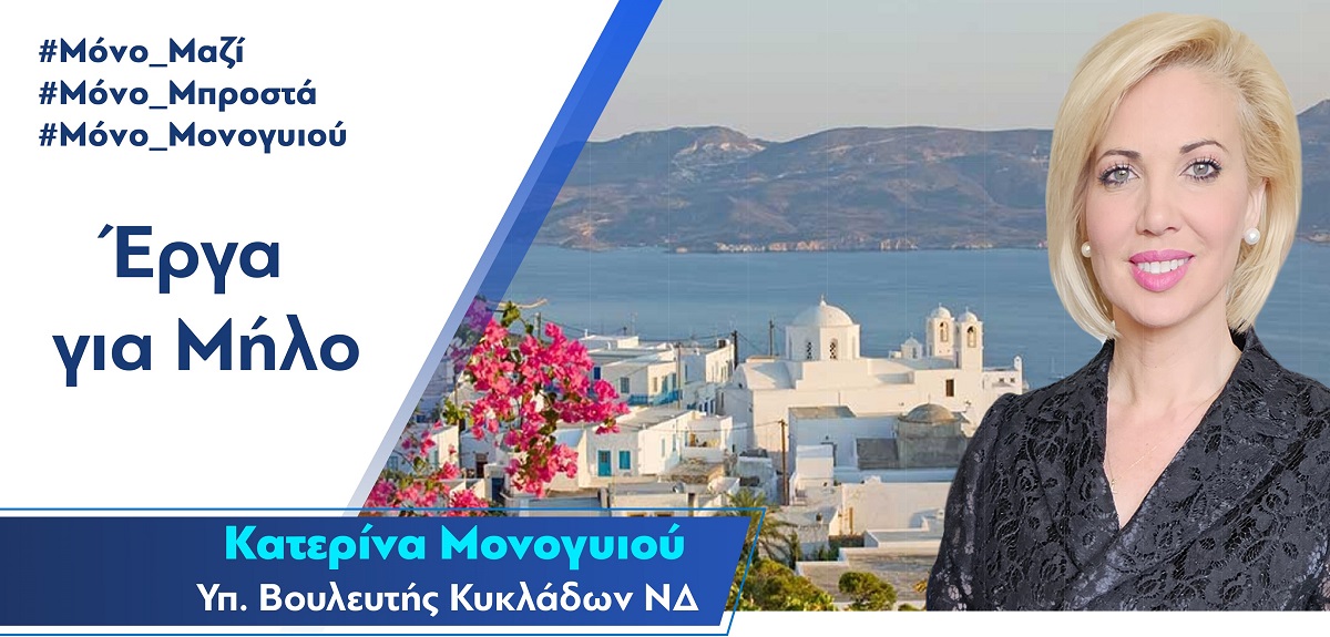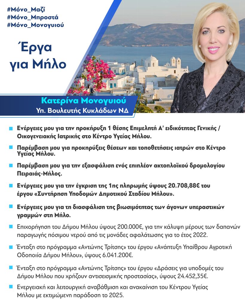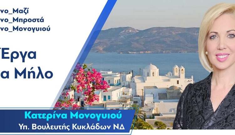 Η υποψήφια βουλευτής Κυκλάδων της Νέας Δημοκρατίας κ. Κατερίνα Μονογυιού περιόδευσε στην Μήλο, όπου πραγματοποίησε ομιλία και ανοιχτή συνάντηση με τους πολίτες του νησιού. Το διάστημα 2019-2023, η Κατερίνα Μονογυιού πραγματοποίησε μία σειρά ενεργειών με σκοπό τη βελτίωση του βιοτικού επιπέδου στο νησί καθώς και για την περαιτέρω ανάπτυξη του. Ειδικότερα, έλαβε πρωτοβουλίες για προκηρύξεις θέσεων και τοποθετήσεις ιατρών στο Κέντρο Υγείας Μήλου, εξασφάλισε ένα επιπλέον δρομολόγιο Πειραιάς-Μήλος και παράλληλα έλαβε μία σειρά ενεργειών για τη διασφάλιση της βιωσιμότητας των άγονων υπεραστικών γραμμών στην Μήλο και την Κίμωλο. Με παρέμβαση της Κατερίνας Μονογυιού εξασφαλίστηκε η πρώτη πληρωμή ύψους 20.708,88€ για τη συντήρηση των υποδομών του Δημοτικού Σταδίου Μήλου. Παράλληλα, η Κατερίνα Μονογυιού πρωτοστάτησε στην ενίσχυση του αεροδρομίου του νησιού με προσωπικό καθώς και στην επέκταση του, για το οποίο χρηματοδοτήθηκε ο Δήμος με το ποσό των 2 εκ. ευρώ για τις απαλλοτριώσεις και με 200.000€ για την περίφραξη του. Το ίδιο διάστημα, η Κυβέρνηση της Νέας Δημοκρατίας και του Κυριάκου Μητσοτάκη στήριξε έμπρακτα το νησί μέσω χρηματοδοτήσεων και επιχορηγήσεων με σκοπό την ανάπτυξη και τη βελτίωση των έργων υποδομής. Αξίζει να επισημανθεί ότι εγκρίθηκε για τον Δήμο Μήλου η ένταξη του έργου «Δίκτυο ακαθάρτων Αδάμαντα και εγκατάσταση επεξεργασίας και έργα διάθεσης επεξεργασμένων λυμάτων» συνολικού προϋπολογισμού 10.561.063,38€ και πρόκειται για το μεγαλύτερο ποσό χρηματοδότησης που έλαβε ο Δήμος Μήλου.